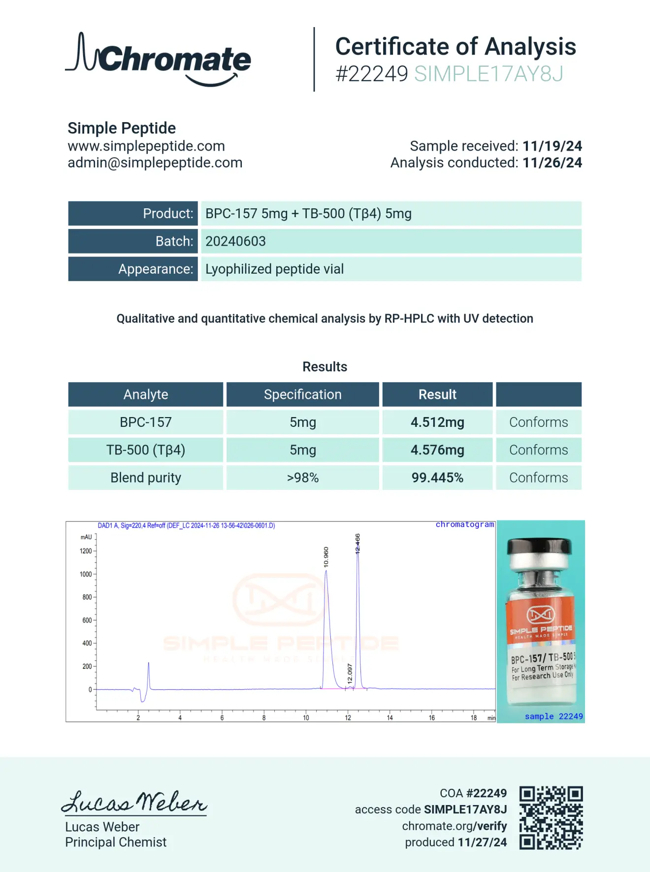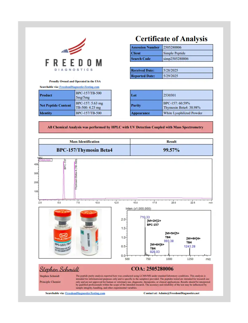 Simple Peptide is a chemical supplier. Simple Peptide is not a compounding pharmacy or chemical compounding facility as defined under 503A of the Federal Food, Drug, and Cosmetic Act. Simple Peptide not an outsourcing facility as defined under 503B of the Federal Food, Drug, and Cosmetic Act.