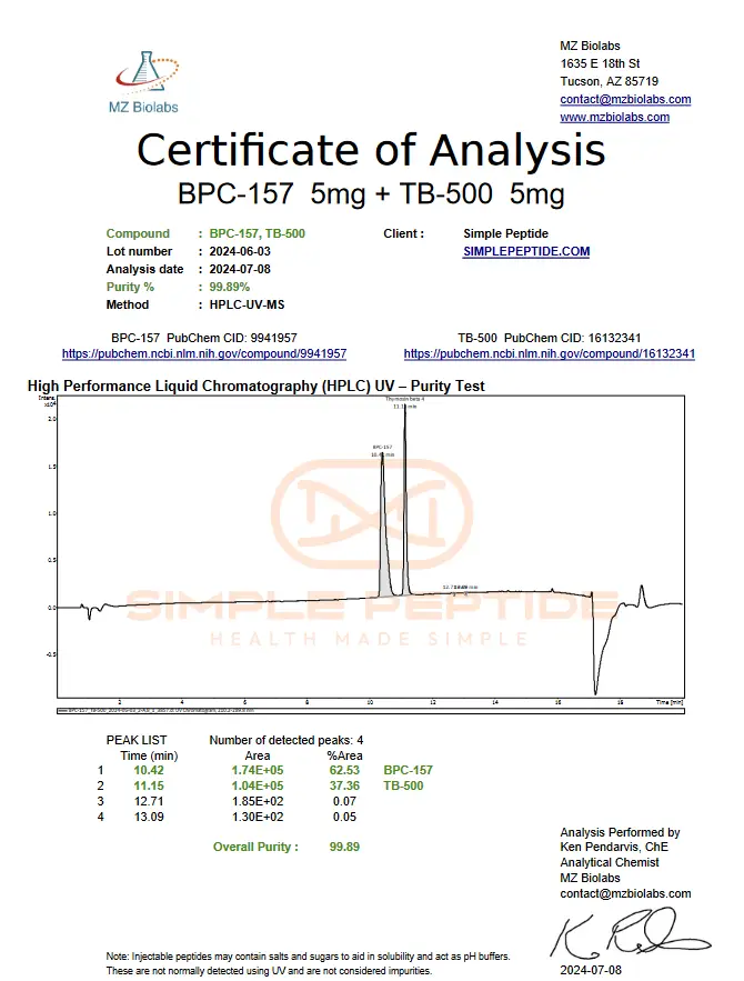 The TB-500/BPC-157 blend combines two peptides with distinct mechanisms of action: